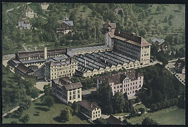 Zeigt die volle Belegung des Areals. Das Hochhaus ab 1915 in Etappen gebaute und 1919 für Zähler- und Schaltuhren-Montagen bezogen. Die Shedhallen mit der Eicherei und dem Versand umfasst 9 Dachreihen.